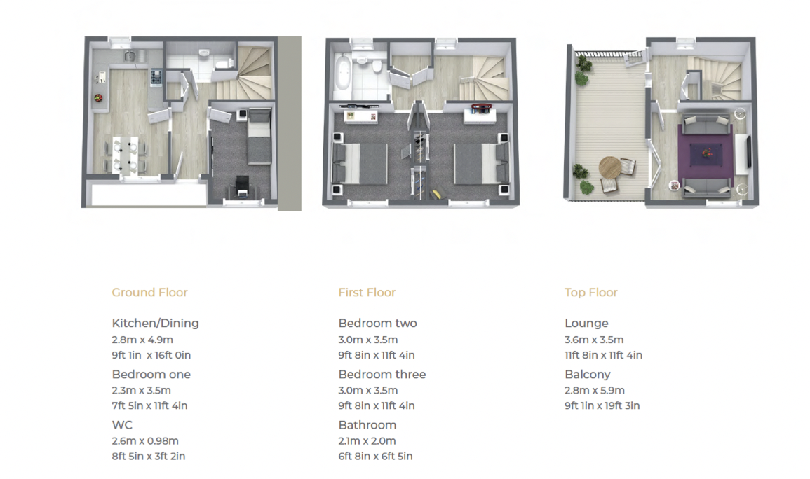 Two bedrooms, both with fitted wardrobes and a family bathroom sit on the first floor The top floor provides a fantastic living space made up of the lounge and an almost six metre terrace to let you take in the city views. Driveway parking and private gardens complete this great new style of home.